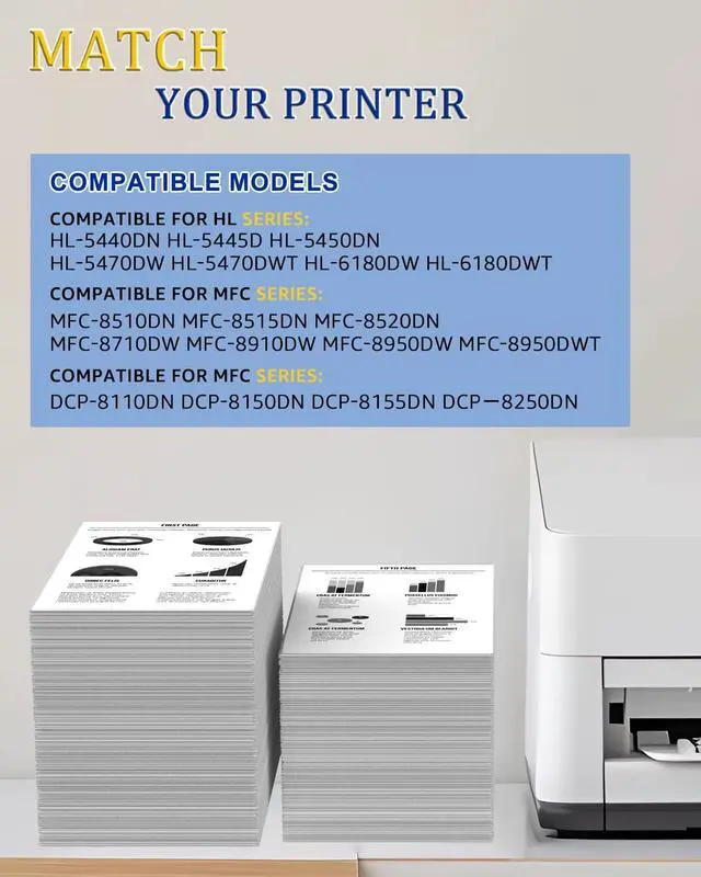 ^^ Page Yield: Up to 8, 000 pages per TN750 TN720 black toner cartridge (based on 5% coverage of Letter size Paper). Actual toner yield varies with usage, graphics printed and environmental conditions. ^^ Compatible for