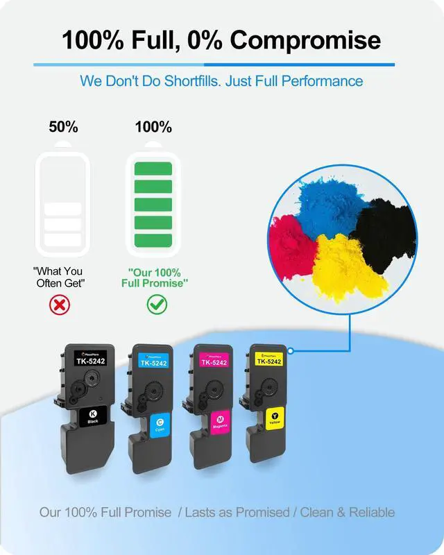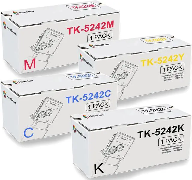 Model Number: This package contains the complete TK-5242 series, including TK-5242K Black, TK-5242C Cyan, TK-5242M Magenta, and TK-5242Y Yellow cartridges. Filled with premium Grade-A toner powder that ensures sharp text and vibrant graphics with consistent results from first to last page.