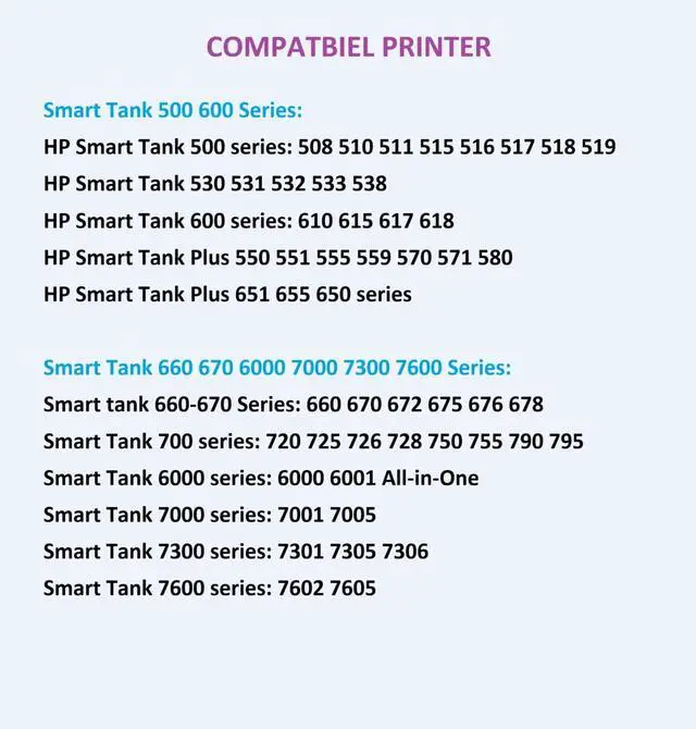 HP Smart Tank Plus: 550 551 555 559 570 571 580 HP Smart Tank Plus 650 series: 650 651 655 Smart Tank 660 670 6000 7000 7300 7600