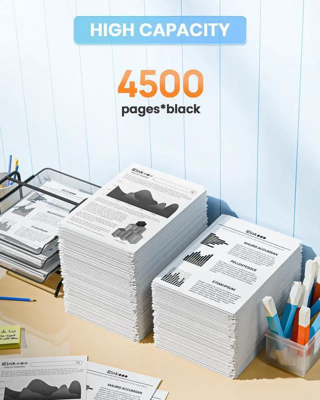 • Page Yield: Black is 4500 pages per cartridge at 5% coverage.