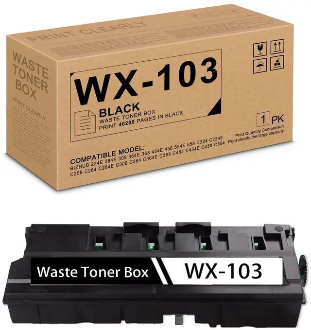 Please check the model you need before buying! The contents of the package you will get: 1 Pack Black WX-103 Waste Toner BoxCompatible with the following printer models: bizhub 224ebizhub 284ebizhub 308bizhub 364ebizhub 368bizhub 454ebizhub 458bizhub 554ebizhub 558bizhub C224bizhub C224ebizhub C258bizhub C284bizhub C284ebizhub C308bizhub C364bizhub C364ebizhub C368bizhub C454bizhub C454ebizhub C458bizhub C554bizhub C554ebizhub C558bizhub C658Muratec MFX-C2280Muratec MFX-C2280Muratec MFX-C3680Strict