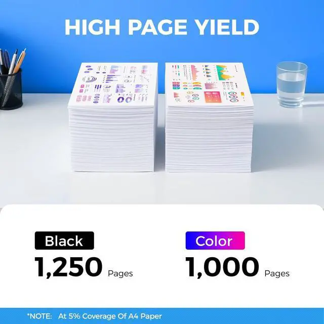 ^^ Page yield: 1250 pages per cartridge (Black), 1000 per cartridge (Color).