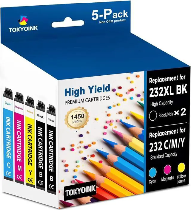 Product Name: TOKYOINK 232XL Remanufactured Ink Cartridges Combo Pack5 Pack Compatible for 232 XL T232 Ink Cartridge for XP-4200 XP-4205 WF-2930 WF-2950 Printer Ink Cartridge (2x 232XLBlack, 1x 232 Cyan, 1x 232 Magenta, 1x 232 Yellow Ink Cartridges) ^^ 232xl Remanufactured ink cartridges combo pack works with WF-2930 WF-2950 XP-4200 XP-4205 printers with the latest chips. Available for all firmware version printers that use for 232XL ink cartridges ^^ TOKYOINK 232xl ink cartridges for printer High page yield with 1100 pages printouts per 232XL black ink cartridge and 350 pages per 232 color ink cartridges at 5% coverage (A4/letter) ^^ Package contents include 2 232xl black ink cartridge, 1 232 cyan ink cartridge, 1 232 Magenta ink cartridge, 1 232 yellow ink cartridge, and 1 user manual.