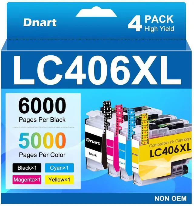 Package Contents: 1LC406XL Black, 1LC406XL Cyan, 1LC406XL Magenta and 1LC406XL Yellow for Brother LC406 ink cartridges for Brother MFC-J1010DW ink (4 Combo Pack LC406XL in Total, NON-OEM Cartridges) ^^ High Pages Yields for Brother Ink LC 406: 406 XL ink cartridges for Brother printers up to 6000 pages per LC406XL black and 5000 pages per LC406XL cyan, magenta and yellow color ink cartridges combo pack compatible for Brother LC406 ink cartridges (A4 letter, at 5% coverage).