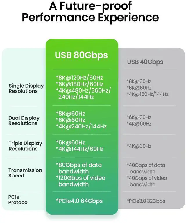 Multiple Screen SetupsGet an extraordinary visual experience with maximum resolution of 16K. Connect dual 8K/6K or triple 4K@144Hz displays to provide sharp clarity and precise detail, which is ideal for graphic designers and multimedia professionals. Up to 4K@480Hz, it reduces screen tearing, drag, lag, and improves the smoothness and responsiveness of the game. Support daisy chain to create a powerful workstation.