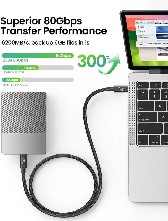 80Gbps Data TransferFitee USB 4 Version 2.0 cable delivers a lighting-fast 80Gbps bidirectional data transfer speed, back up 6GB files in 1s. Reduce your waiting time and increase efficiency. This USB C data cable is fully compatible with Thunderbolt 5, ensuring top-tier connectivity.