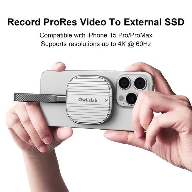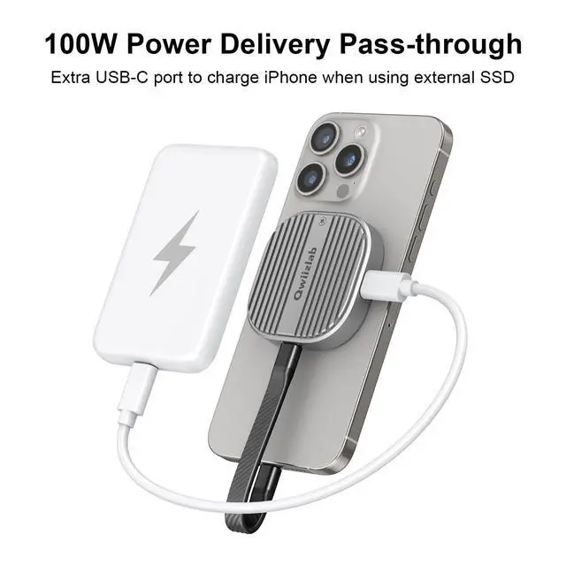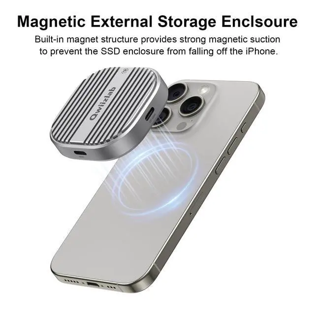Product 1: QWIIZLAB Magnetic M.2 NVMe SSD Enclosure with Magsafe for iPhone 15 Pro Max ProRes, 10Gbps USB 3.2 Type-C, Fits 2230 M-Key up to 2TB, Supports PCIe UASP, Rugged Aluminum Chassis (Gray)
