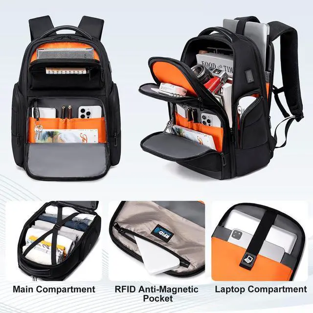 Durable material ]: Travel Laptop Backpack Made of 1680D water resistant oxford fabric and ultra-fiber leather material, paired with quality polyester lining, rugged SBS-brand zippers and buckles. Delivering long-lasting protection for you ^^ [ Large Capacity & Multi- compartment ]: Large backpack have 5 main compartments and multiple functional pockets. It includes a unique RFID blocking pocket to protect your ID cards and credit cards from electronic theft. Multi- compartments design makes your item organized and easier to find ^^ [ Expandable