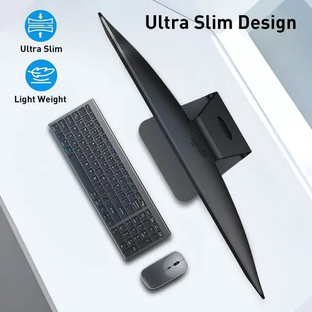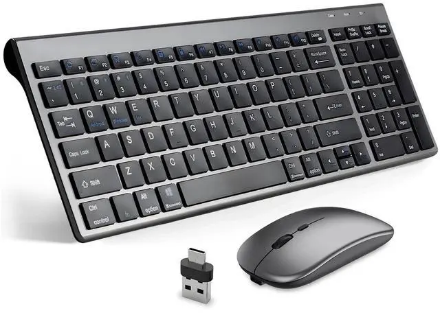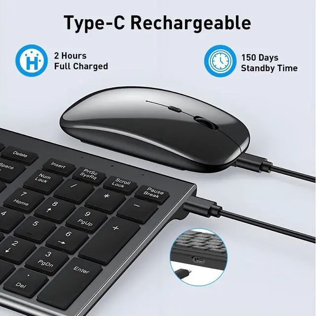 ^^ Type-C RechargeableCordless keyboard and mouse set has built in rechargeable battery, 2 hours full charge can hold on for 200 days standby time. It also has on/off switch and power-saving auto-sleep mode. ^^ Ultra Slim DesignWireless keyboard and mouse has ultra slim design, the thinnest part has been reduced to 0.24 in for the keyboard and 1.05 in for the mouse, which looks high end and avant-garde on your desk. The keyboard also has inclined design for comfortable typing. ^^ Wide CompatibilityKeyboard and mouse combo compatible with all Mac OS, Windows, Android system devices.