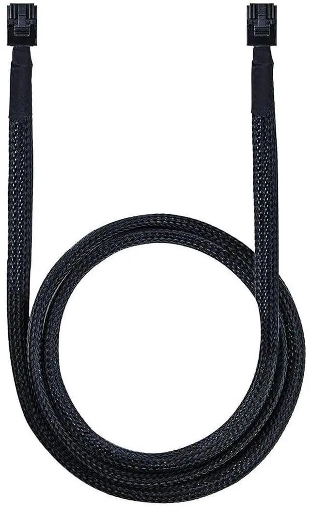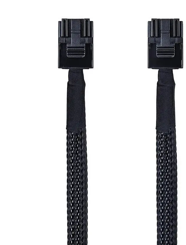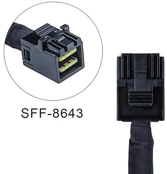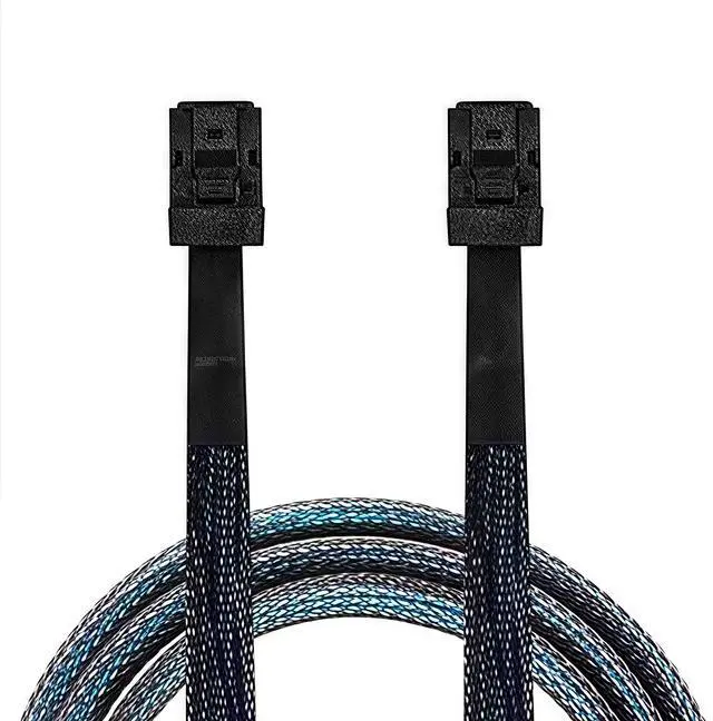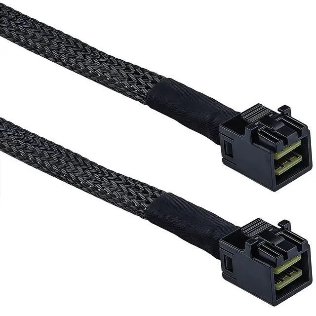This internal Mini-SAS HD cable connects an SFF-8643 4-lane RAID/HBA controller to an SFF-8643 backplane. Rated for SAS-3 12Gbps, it uses 30AWG conductors with 100-Ohm impedance to preserve signal integrity on short controller-to-backplane runs. Sideband/SGPIO enables enclosure management and drive activity LEDs, while straight, latch-equipped plugs and a braided jacket make routing secure and clean inside server or NAS chassis.