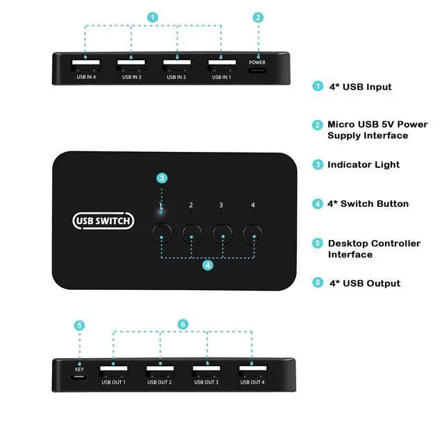 4 Port USB Switch Box - The 4 in 4 out USB Switcher allows you to share 4 USB 2.0 peripheral devices (keyboard, mouse, scanner, printer, flash drive and USB stick) between 4 computers. Without constantly swapping cables or set up complicated network sharing software. ^^ Two Switching Methods - This USB Switcher Selector supports switching between computers using panel buttons or wired desktop controller. You can easily switch devices by a click on the button. And LED indicating the active computer. ^^ Wide Compatibility - Plug and play, driver-free for Windows 10/8/ 8.1 /7/Vista/XP and Mac OS, Linux, Chrome OS.