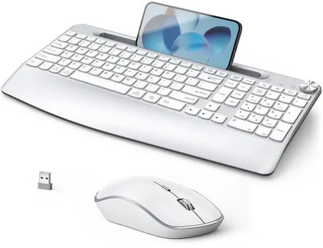 FULL SIZE KEYBOARD WITH PHONE HOLDER: JOYACCESS wireless keyboard is compact without giving up too much in the way of functionality since the full size keyboard has all the keys you need. Even when concentrated on work with office computer, you'll never miss any messages from your phone with this white keyboard, since the built-in cradle can prop up your smartphone horizontally or vertically at a perfect angle to read or watch videos.