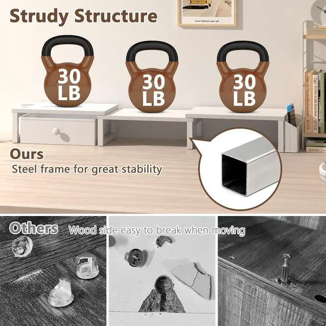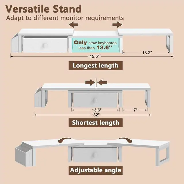 [Sturdy and Durable] This monitor stand is made of high-quality metal and particle board, each board can bear 66 pounds to meet your daily needs, and the bottom of the monitor riser is equipped with a grid-shaped rubber gasket, which can effectively prevent the product from sliding, making the desktop storage more firm and stable ^^ [Sufficient Storage Space] This desk shelf creates more practical space for you by raising the height of the monitor. The monitor, notebook, printer and decorations can be placed above the desk monitor stand, and the spacious area below can be used to place mouse, keyboard, books and other items, making your desktop tidier and creating a more comfortable office environment ^^ [Smart and Adjustable] Our computer monitor stand adopts a telescopic design and can be adjusted from 32 inches to 45.5 inches.