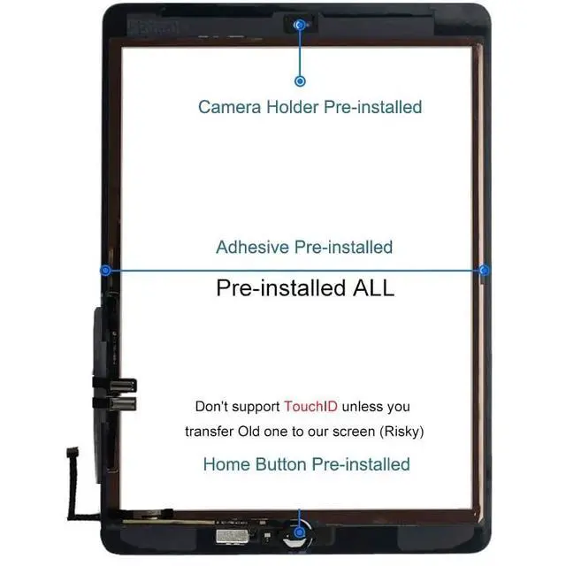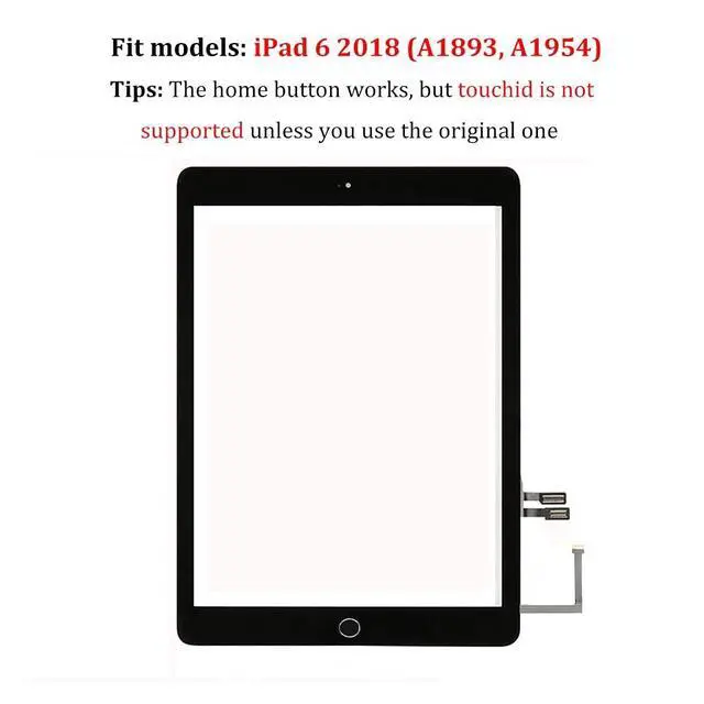 Includes: x1 Black IPad 6 2018 Glass Touch Screen Replacement x1 Home Button Flex with Rubber Gasket x1 Camera Bracket x1 Microfiber Cloth x1 Magnetic Philips Screwdriver x1 Metal Spatula/Scraper x1 Strong Suction Cup x6 Triangle Opening Tools x1 Pry Opening Spudger x1 Black Spudger x1 Tweezer