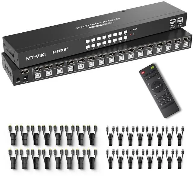 MT-VIKI KH16S, this 16 port kvm switch hdmi allows you to manage up to 16 computers by 1 monitor, keyboard and mouse at 4k 60hz HD quality; Come with 4 USB 2.0 hub. Perfect for 19-inch rack cabinet ^^ HDMI KVM Switch Support Resolution up to 4K@60Hz, and backward compatible 4K@30Hz, 1080P. Support HDMI 2.0, HDCP 2.2, 18Gbps. ^^ USB HDMI switch with 4 USB 2.0 ports for sharing keybaord, mouse, printer, U disk and more other USB devices. Support wireless keyboard and mouse. ^^ KVM Switch 4K@60Hz with Audio Output Support 2 Ways for