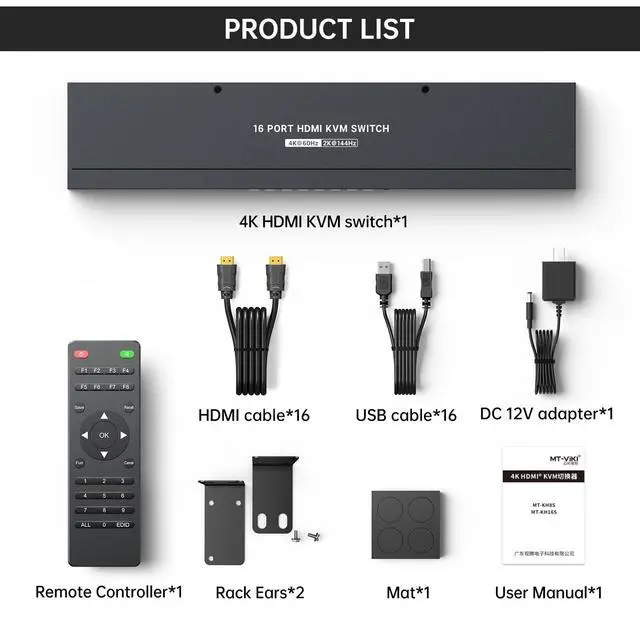 ^^ Package Includes: 1* 16 port KVM Switch HDMI, 1* IR Remote Control, 16*HDMI Cables, 16*USB Cables, 1* user manual, 1* set rackmount ears & screw, 1* 12V DC Power Adapter