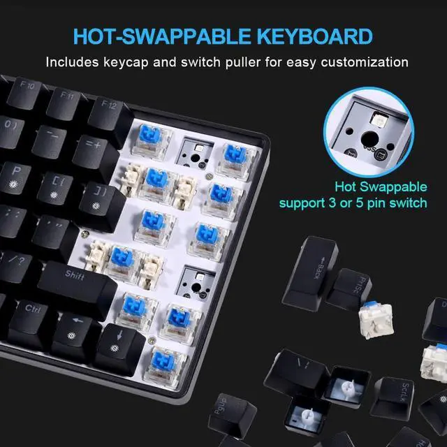 ^^ Hot-Swappable: Support with 3-pin / 5-pin switches. Swap switches to personalize how your keyboard feels and sounds. Comes with a keycap and switch puller, easy to swap out switches.