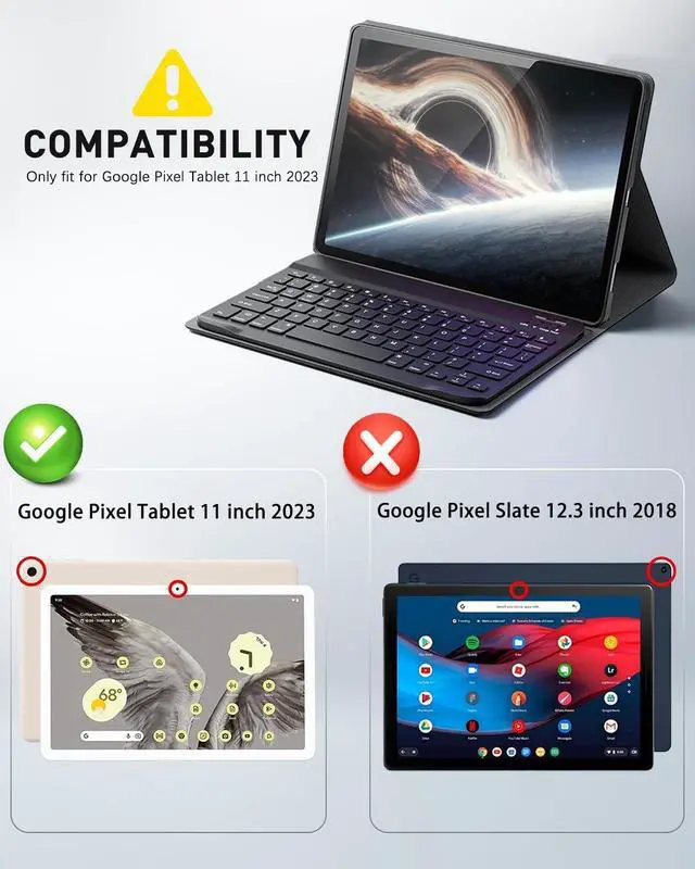 Model CompatibilityKeyboard Case Designed ONLY for 2023 Released Google Pixel Tablet 11 inch ONLY. Not compatible with any other devices. Please kindly check the model number before purchase. ^^ Magnetically Detachable Keyboardcase for Google Pixel Tablet 11 inch 2023 comes with a detachable magnetic keyboard. The ultra-thin and lightweight magnetic keyboard can be firmly attached to the case, which helps the tablet stand upright and turn it into a mini laptop in less than a second. You can move and change the keyboard position at any time according to your usual preferences. ^^ Adjustable Viewing Angles and Support for Pencase supports 3 viewing angles and has anti-slip slots.