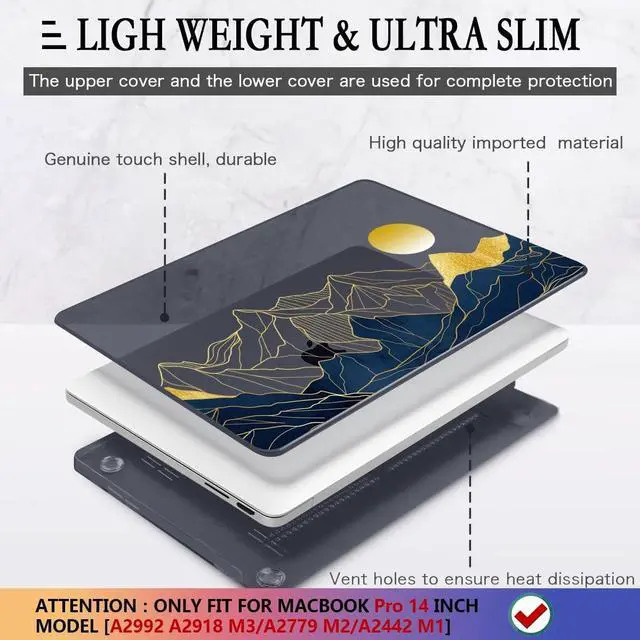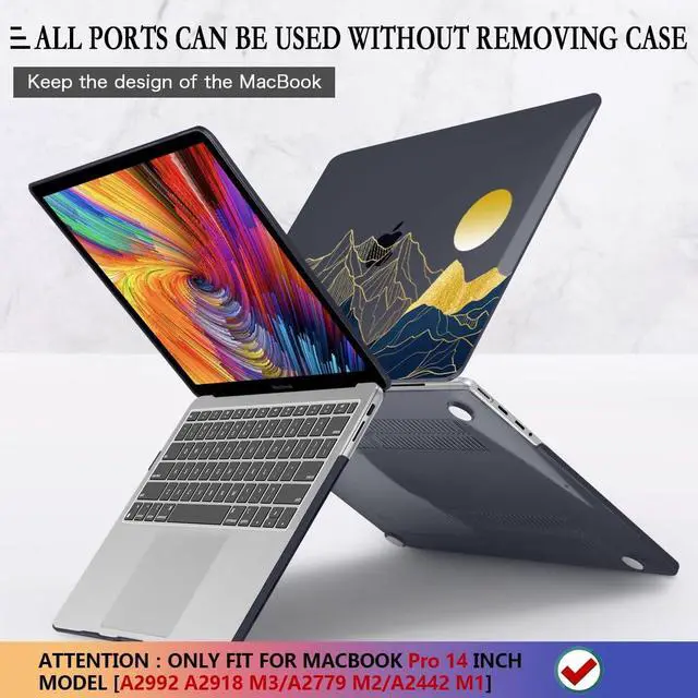 ^^ Attention: This case is NOT compatible with MacBook Air or Pro 13/15/16 and other models or Sizes. Please Check Your MacBook Model "Axxxx" on the bottom before Purchase. Make sure youre ordering the correct 14 inch size. ^^ Pretty Printed Case on a plastic hard case with soft touch texture. Logo no cut out design, that also makes your Silver/Space Gray/ Midnight / Black mac book pro 14 m1 m2 m3 m4 out of ordinary while keep the original design. ^^ Two Pieces Snap on Design, easy to clip on/ take off, let you open/close your MacBook freely. Access to all ports without removing the case. Bottom cover heat dissipation and raised rubberized feet to keep your laptop firmly. ^^ 5in1 Bundle