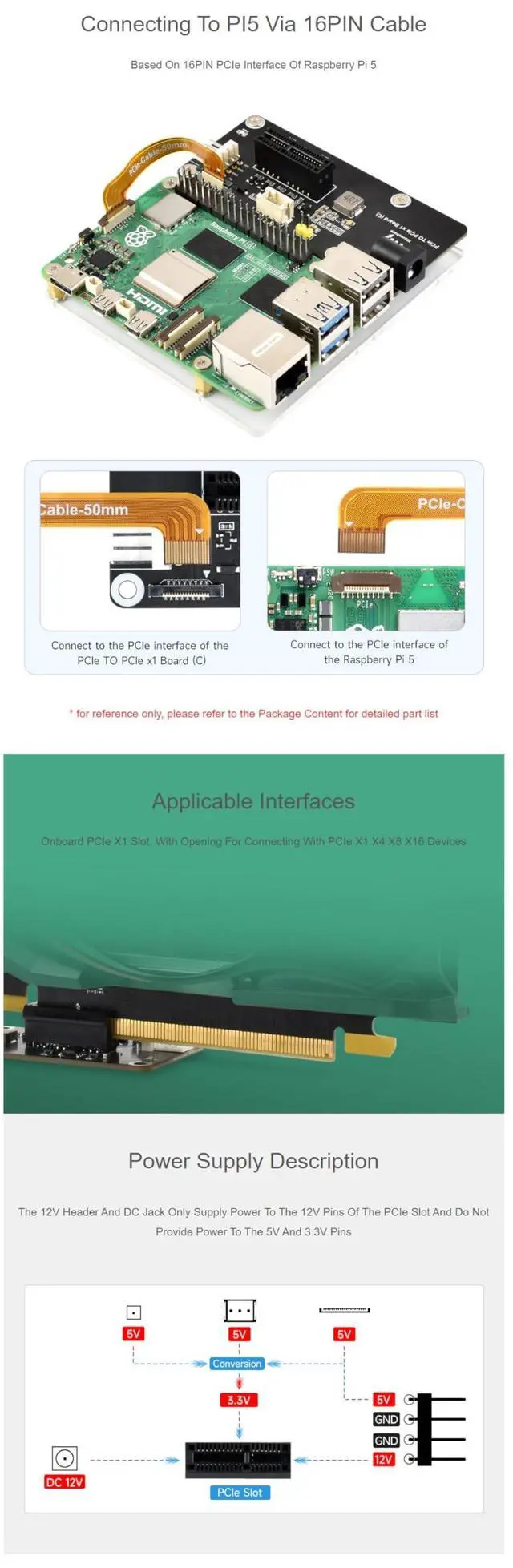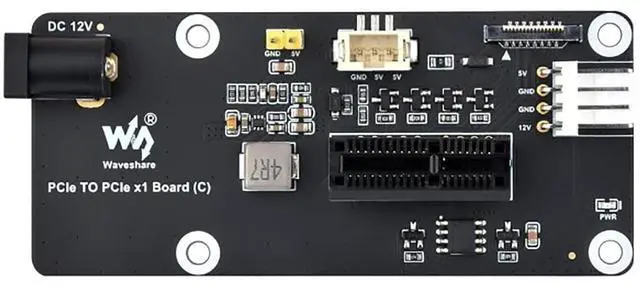 Key Features: Optimized for Raspberry Pi 5Designed for the Raspberry Pi 5, this adapter board uses a 16PIN PCIe interface and includes a 16PIN FFC connector for secure, high-speed data transfer. Broad CompatibilitySupports PCIe x1, x4, x8, and x16 devices, making it versatile for connecting GPUs, network cards, storage controllers, and more. Onboard PCIe x1 SlotFeatures an onboard PCIe x1 slot with an opening for PCIe x1, x4, x8, and x16 devices, ensuring compatibility with a wide range of hardware. Dedicated Power SupplyIncludes a 12V header and DC jack to power the 12V pins of the PCIe slot, ensuring stable performance for connected devices. Compact and Durable DesignBuilt with a compact form factor and durable construction, this adapter board is easy to integrate and reliable for long-term use.