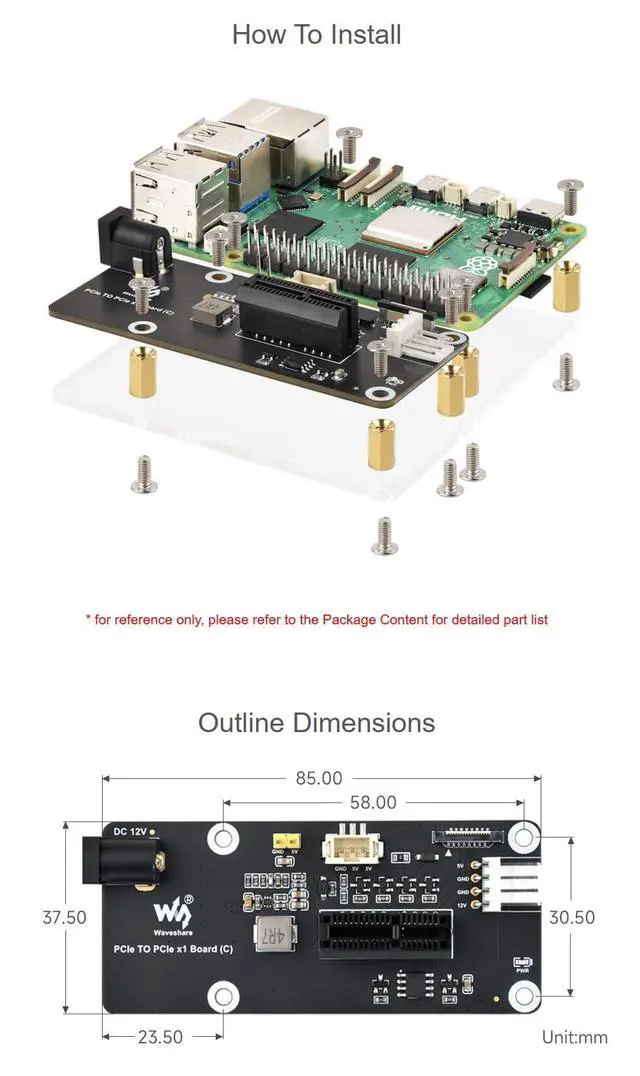 Slot Type: Onboard PCIe x1 slot with opening for x1, x4, x8, x16 devicesUpgrade your Pi 5 with the PCIe to PCIe x1 Adapter Board (C) and unlock a world of possibilities for your projects. Whether you're a tech enthusiast, developer, or hobbyist, this adapter board is your gateway to enhanced performance and connectivity. 1. PCIe TO PCIe x1 Board (C) x12. Transparent acrylic mounting plate x13. PCIe-Cable-50mm x14. PH 2.0 3PIN cable x15. Screws pack x16. 12V 2A power supply x1