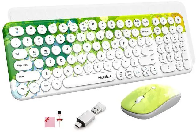 WIDE COMPATIBILITY: Mobifice wireless keyboard and mouse colorful they work perfectly with your PCs, Laptop, Smart TV, desktop computer, etc. Whether is for personal use or as a gift for friends, lovers, or children, it is a perfect choice. The keyboard mouse set contain one USB C Adapter and silicone keyboard cover as gifts, in this way, it can not only be used for Electronic devices with USB interface, but also used for those tablets that own Type-C ports treat as external keyboard.