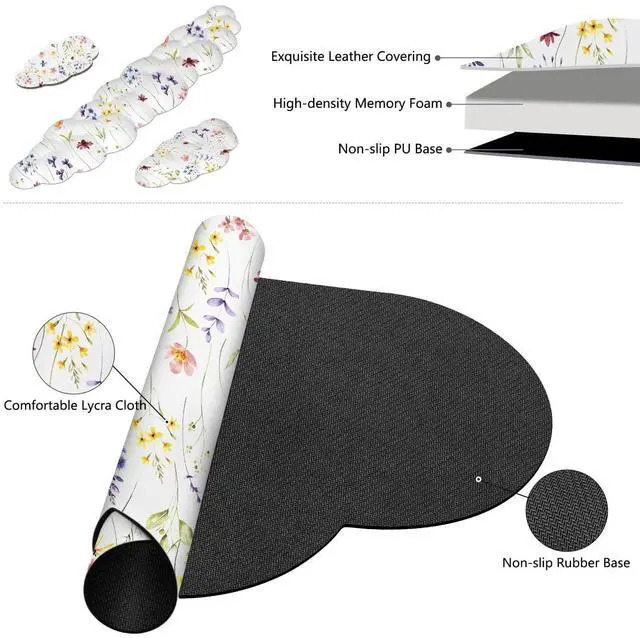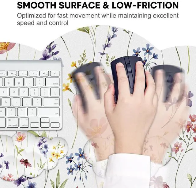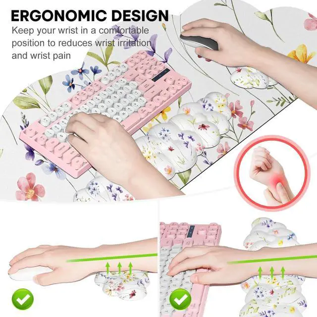 4-in-1 Cloud Wrist Rest SetIncluded 1pcs XXL cloud mouse pad measures 35.4 x 15.7 inches for providing ample room to fit your gaming mouse full-size mechanical keyboard and other desk items, 1pcs cloud keyboard wrist rest for keyboard, 1pcs cloud mouse wrist rest pad for mouse, 1pcs cloud cup pad for cup ^^ Ultra-smooth Surface XXL Cloud Mouse Pad is made of Premium-textured and smooth lycra cloth surface that the mouse glides over nicely, it is optimized for fast movement while maintaining excellent speed and control, great for daily work or gaming ^^ Savior of Wrist PainThe comfortable memory foam-filled cushion and ergonomic structure conform to your wrist for maximum comfort and support, it reduces wrist irritation and wrist pain, helps treat and prevent carpal tunnel syndrome ^^ Anti-slip Rubber BaseDense anti-slip rubber base provides heavy grip preventing sliding or movement of mouse pads, available for any flat, hard, tabletop surface.