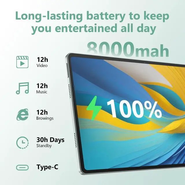 ^^ 8000mAh Large Battery+18W Fast Charging This rugged tablet built-in a 8000mAh large battery, you will freely enjoy reading or watching videos for 8-12hours on a full charge. No need to worry about the battery while you are traveling on the way. Please use only 18W or 10W charge adapter not support 20W or 30W, and please have a charge more than 2 hours for the first time using ^^ WiFi6 & Bluetooth 5.0 This 2025 newest Wifi Tablet possess the newest AX WiFi 6 module, easily connect with incredible and reliable speeds. Easily browse Internet, Play game and pair Bluetooth 5.0 - Comes with free screen protector.