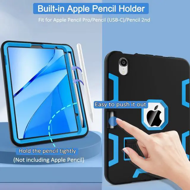 Number: A2567/A2568/A2569). Not compatible with any other ipad models, please check the bottom of the back of your ipad to find the model number. ^^ Kickstand This ipad mini 6/7 case has a stand that is easy to push out and fold away, takes up the least space but provides great convenience for daily ipad use. Vertical design is suitable for reading, browsing, while horizontal design is flawless for watching videos, playing games, etc. Choose the best angle according to your needs. ^^ Pencil Holder and Touch ID Specifically designed for ipad mini 7th/6th generation case, with a dedicated built-in pencil slot to safely store your apple pencil, eliminating worries about damage or loss. Wonderful for on-the-go use. In addition, our new case for ipad mini 7 A17 pro perfectly supports Touch ID, and due to precise cutting, it can be quickly unlocked with just a gentle touch. ^^ Triple Protection Top PC material effectively prevents ipad from slipping, inner honeycomb design aids in heat dissipation, while soft silicone outer layer ensures maximum protection against accidental impact or drops.