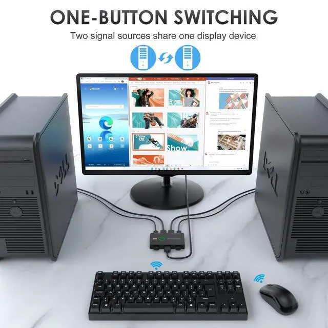 Computers: This KVM switch allows you to one-button control 2 computers with only one set of USB devices, such as mouse, keyboard, printer and monitor. Our USB and HDMI KVM switch for 2 computers take out your desk space, helping you to have a clean and spacious entertainment or work environment ^^ Ultra HD 4K@ 60Hz
