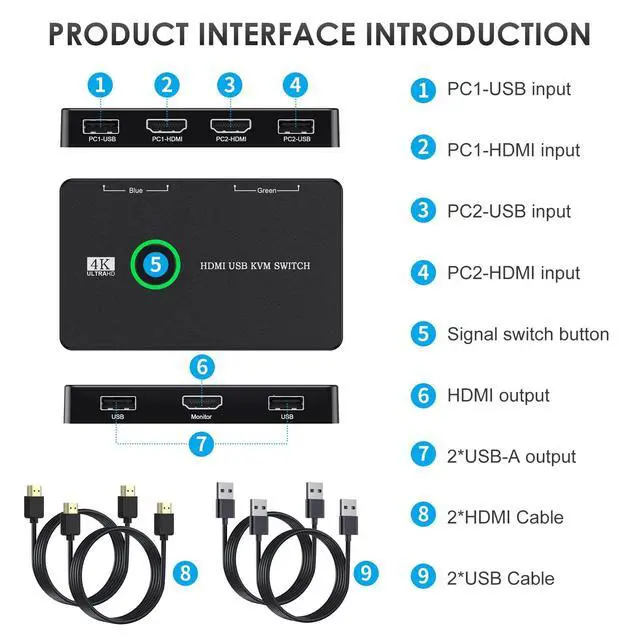 What You Will Get: There are 1x KVM Switch, 2X (1M) USB 2.0 A Cable, 2X (1M) HDMI Cable and 1x User Guide along with this package. Besides, we will provide professional customer service for you. Any other questions, please kindly contact us