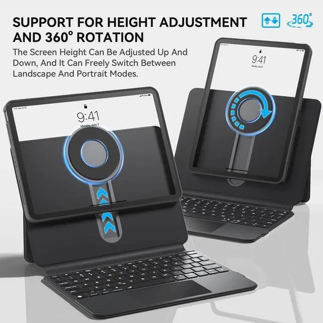 Model: A2925, A2926, A3007, Please check your iPad model number on the back of your device (starting with "A") before purchasing to ensure compatibility. ^^ 360 rotation + magnetic detachable designThis keyboard cover supports 360 rotation, allowing for free switching between landscape and portrait modes. It can be magnetically detached and quickly switched between the protective cover or the standalone keyboard mode, meeting the needs of various scenarios such as office work, entertainment, and drawing, with flexibility and efficiency. ^^ [Can be raised and lowered + adjustable in multiple directions] The innovative adjustable stand design allows the screen height to be adjusted up and down. The back cover supports multi-angle free hovering (0-180). Whether for typing, watching movies or drawing, you can find the best comfortable viewing angle. ^^ 7-color backlit keyboard + touchpad 7-color backlit keyboard with 3-level adjustable brightness, capable of providing excellent typing performance in any lighting conditions; the scissors-style key mechanism (1mm key travel) offers a quiet and sensitive typing experience, and the upgraded 120Hz high-refresh rate touchpad supports multi-point gestures ^^ All-inclusive anti-drop + pen slot storage Soft TPU edge protection for anti-drop and anti-scuffing, easy installation without damaging the iPad; The pen slot securely stores the Apple Pencil, preventing loss and ready for use at any time.