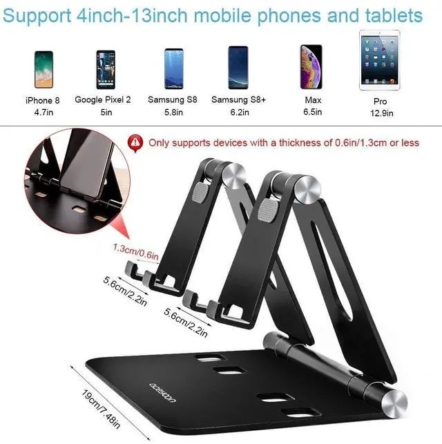 Wide compatibilityAluminum smartphone stand for desk adjustable, could put two phones at the same time. Support 4'-13' mobile phones and tablets, widen hook design, perfectly match the device with thickness less than 0.6 in/ 1.3 cm, thickened phone case can also be used easily. Such as X / 8 / 8 Plus / 7 / 7 Plus / 6S / 6S Plus / 6 / 6S, Pad Pro, Pad Air, Pad mini, S3 S4, Note 6 5, compatible for Nexus 5, compatible for XperiaXZ, etc.