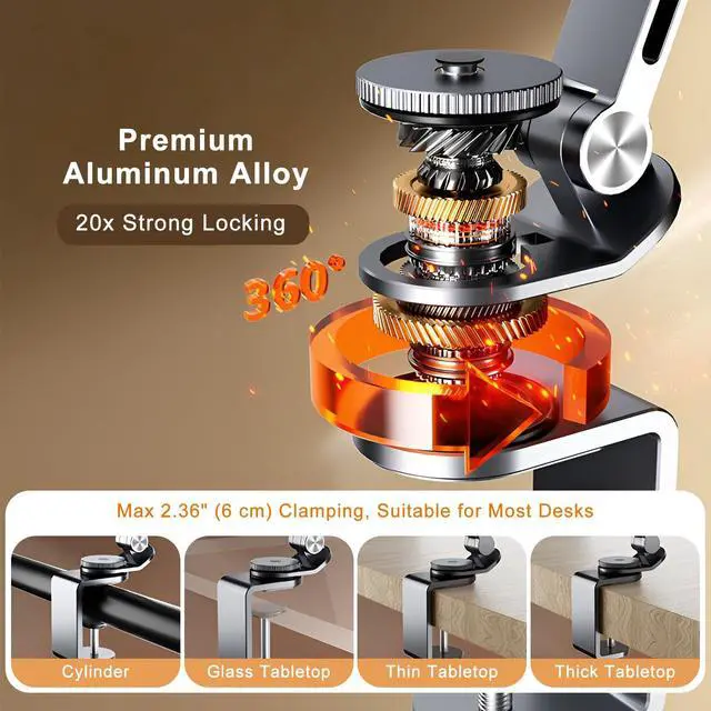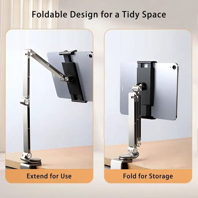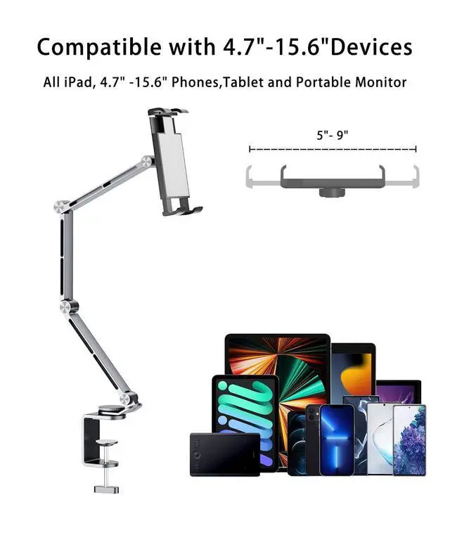 WIDE COMPATIBILITYThis iPad mount supports 4.7" - 15.6" devices, including iPad Pro/Air/Mini, Samsung Galaxy Tab S9/S9+ Plus/S9 FE/S9, Kindle Fire HD 10/8, Surface Pro 9/8/7, portable monitors, and any Small Camera, Webcam, Lights with a 1/4" threaded mount. ^^ PREMIUM ALUMINUM BUILD Crafted with high-density aluminum alloy, this tablet stand features a sleek, minimalist design with a thickened tube for enhanced stability. Its durable construction ensures long-lasting use without rust or fading. ^^ FULLY ADJUSTABLE DESIGNFeaturing a 3-section long arm and 360 rotating base, this tablet holder mount offers greater flexibility and longer reach.