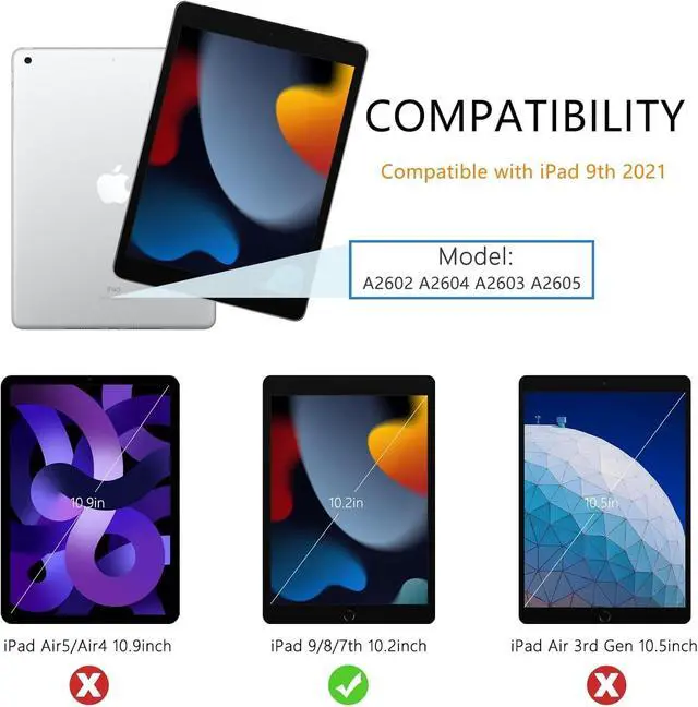 [iPad Keyboard Case Compatibility] This iPad keyboard case is designed for 10.2 inch iPad 9th generation 2021 (A2602/A2604/A2603/A2605), iPad 8th generation 2020 (A2270/A2428/A2429/A2430), iPad 7th generation 2019 (A2197/A2200/A2198), iPad Air 3rd generation (A2123/A2152/A2153/A2154) 10.5inch, iPad Pro (A1701/A1709/A1852) 10.5inch. Please check the model number on the back of your iPad before purchasing.