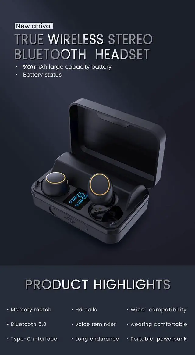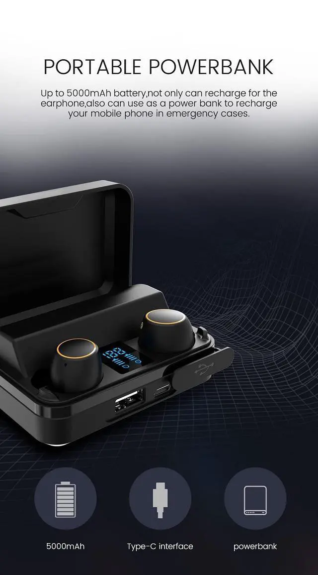 With Type-C tech. The LED screen will display the charge status of the earbuds and the charging case. You can also use the charging case as a power bank to charge mobile phones, you dont need to bring another big heavy power bank. And the charging case skillfully uses angle design, can be used as phone holder. ^^ Built-in Dual Noise Cancelling Microphone & IPX7 WaterproofThe built-in high-quality microphone of the wireless headphones can provide you with clear call experience. Ergonomic Design makes them really comfortable to wear. Otherwise, the earbuds are made of high quality waterproof materials, multi-process design headphone body, can effectively protect the internal components from water, rain and sweat.