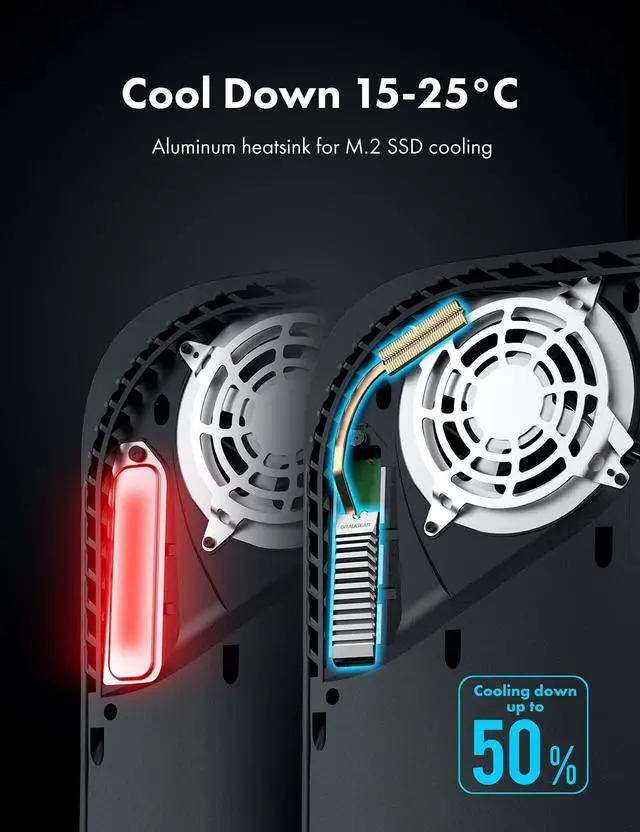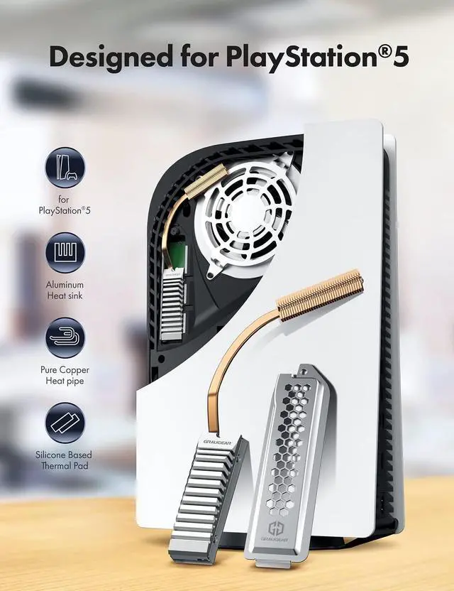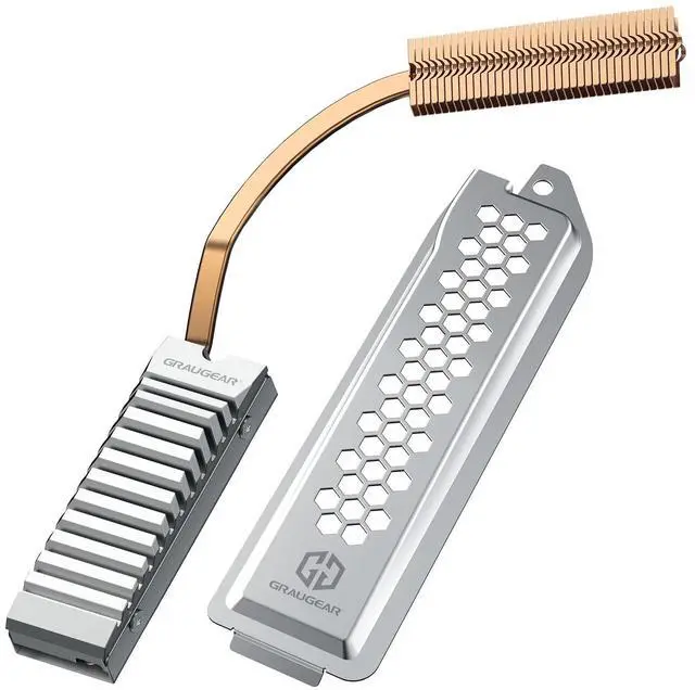 2 SSD by up to 45%. Combined with copper heat pipe and aluminum fins to achieve better heat dissipation performance ^^ Copper Heat PipeCopper heat pipes provides maximum cooling performance by using DTH (Direct Touch Heat). Its flat machined surface touches the SSD evenly and conducts heat extremely fast ^^ M. 2 2280 NVMe SSDCompatible with both single-sided and double-sided of M. 2 2280 NVMe SSD ^^ Package ContentsGRAUGEAR PS5 M. 2 NVMe SSD heatsink with cover, 4 thermal pads, screwdriver, screws, warranty card, user manual and friendly customer service
