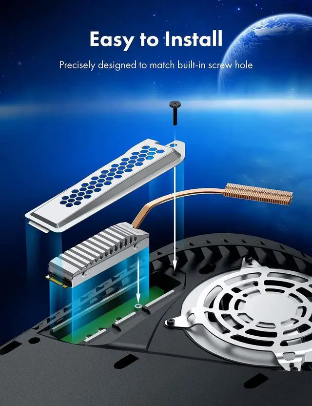 PS5 SSD Heatsink Cover SetM. 2 SSD dust cover with the extruded aluminum heatsink is designed to fit PlayStation 5 and improve the thermal performance of the SSD mounted in the expanded storage slot. The metal cover perfectly fits into the expansion slots of the PS5 and features with the dust filter, copper heat pipe and plate-fin design of aluminum alloy. The better heat dissipation of SSD heatsink, the higher endurance of your PS5 M. 2 SSD drives ^^ Heat Dissipation CoverThe ventilation holes of the cover ensures the best thermal conducting efficiency and reduces heat from M.