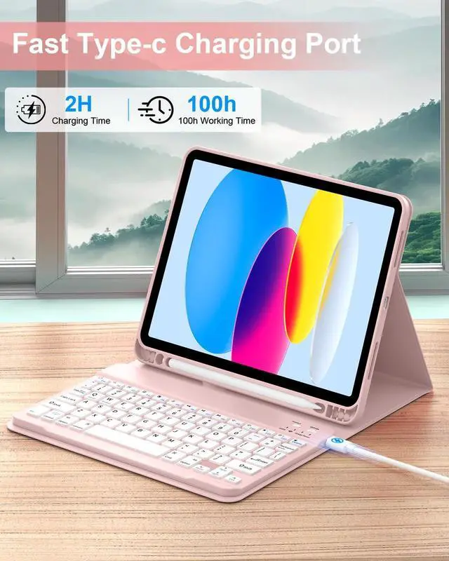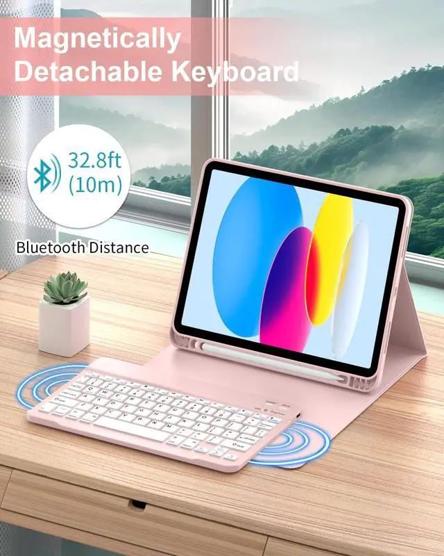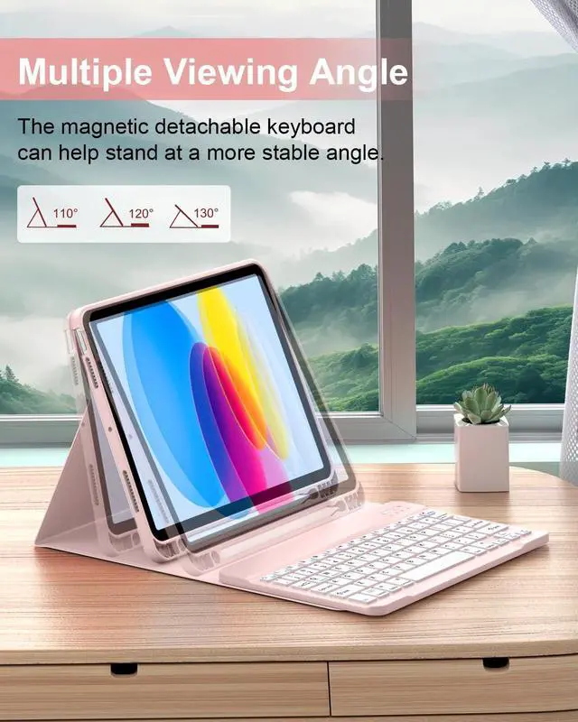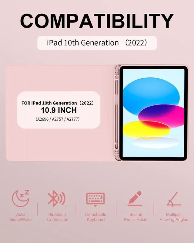 Model: A2696/A2757/A2777 ). NOT compatible with any other iPad models. Please check the back bottom of your iPad to find the model number before placing order. ^^ Long Life Battery & Magnetic Detachable Keyboard Case Built-in premium Li-ion battery with energy-saving mode, 2-3 hours full charge, work for at least 80 hours, stand by for 130 days. A spring mechanism underneath each key ensures a tactile response with every stroke, helping you to type faster and with less error than on a touchscreen. Please charge it when keyboard power indicator flashing Red. ^^ Precise Cutouts & Full Body ProtectionPrecise cutouts allow full access to all features and offer the perfect protection, convenience for daily use. Keyboard case comes with honeycomb grid pattern design is better for heat release and anti-skid. Thoughtful design to effectively extend life of your beloved iPad. Solid keyboard case and wave shock absorbtion give comprehensive protection for your new ipad 10th generation from scratches and damage. ^^ Multiple Viewing Angle and Pen HolderFor iPad Keyboard Case for 11th/10th Gen is magnetically attached and very versatile and the thoughtful design easily adjusts to whatever comfortable angle suits you best.