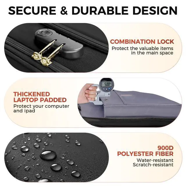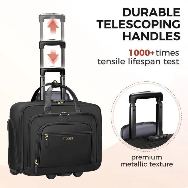 Secure Robust Protection: Safety and durability are at the forefront of the design of this rolling computer bag. The main compartment is equipped with a password lock to protect your valuables and laptop from theft. The thickened inner pads in the notebook computer compartment enhance protection against collision and impact. This bag is made of 900D polyester. The laptop rolling bag is both Water&scratch-resistant. Its shape is very solid and it won't collapse. It's very reassuring to use ^^ TSA - Friendly SizeThis rolling teacher bag measures 17.5 * 7.8 * 14.1 inches (LxWxH) and features a 24.8 retractable handle, achieving a perfect balance between capacity and portability. The carry on luggage offers ample space to hold essentials for 2-3 days and meets carry on size requirements, fitting snugly into airplane overhead compartments with ease Say goodbye to the hassle of checking bags and embrace the freedom of traveling light, all without sacrificing an ounce of storage convenience ^^ Stylish VersatileThis rolling bag is made of durable 900D high-density polyester material and elegant PU leather accents, perfectly combining a fashionable style with practical functions. This laptop bag with wheels is the perfect companion for business trips, vacations, commutes, and more.
