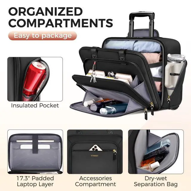 Multifunctional Pockets: The rolling laptop bag features an array of storage options. A side insulated pocket keeps your beverages at the perfect temperature, while the main compartment houses a dedicated 17.3 laptop compartment storage. The multi-functional pocket at the front can store pens, keys and documents very well, and it has an independent waterproof dry and wet compartment, which can effectively prevent leakage to other items. With these versatile pockets, everything has its place ^^