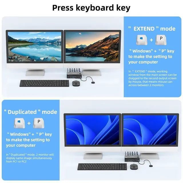 8K KVM Switch for 2 Monitors 2 ComputersThis dual monitor HDMI KVM switch can control 2 computers to share 2 monitors by using 1 set of USB keyboard & mouse. When in copy mode the main screen can be copied to the secondary screen. When in extend mode, the window from main screen can be dragged to second screen. ^^ Support Resolution up to 8KThis 8K dual monitor KVM switcher is a high standard product, support 8K resolution, 7680x4320@60Hz, 3840x2160@120Hz.