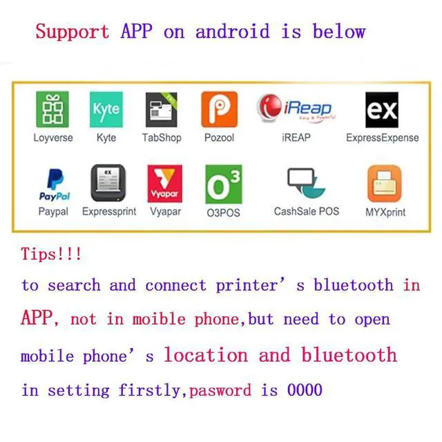 Please confirm with us if before order. ^^ [How to connect bluetooth with mobile phone ] 1, peel off insulation paste on battery, then turn on printer 2, download APP and open App on your mobile phone 3, open mobile phone's bluetooth and location in setting and connect printer's bluetooth, PIN code is 0000, also to connect bluetooth in APP, in APP search bluetooth name of printer and connect it, printer 's blueototh name is on self-test page, then could print receipt in APP ^^ Printing With Bluetooth MAX paper Diameter is 50MM, It's compatible with WINDOWS 7 8 10 11 XP 2000, android device by bluetooth, it's not compatible with MAC OS.