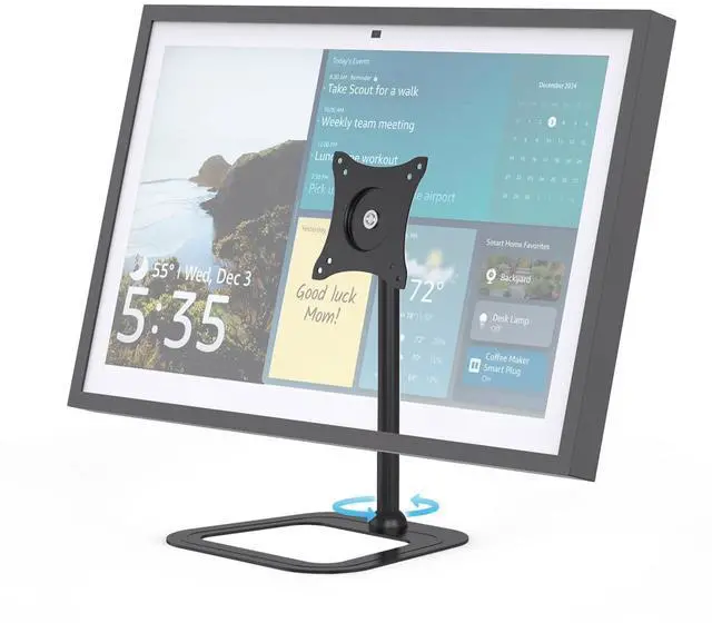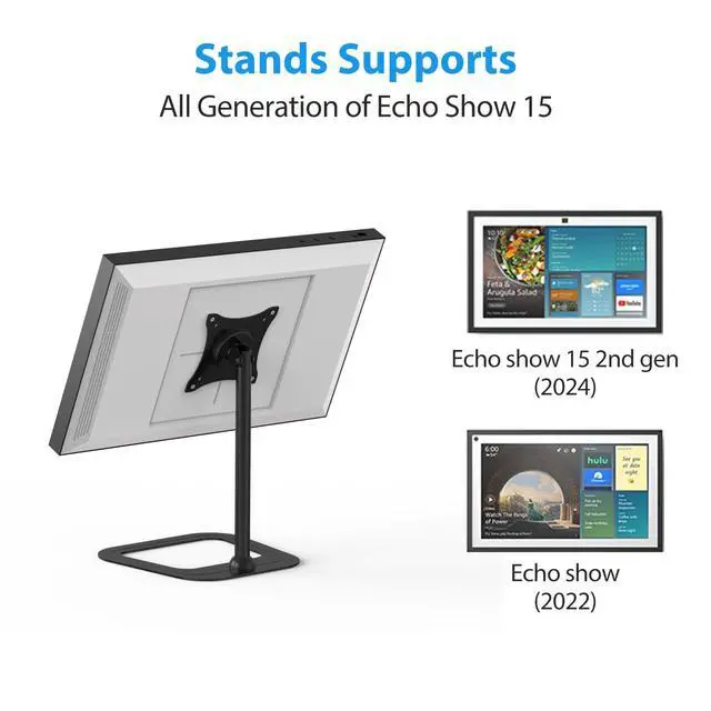 Compatible DeviceThis tilt stand compatible with echo show 15 is designed to work with the Show 15.6" smart display (device is not included) on desk/counter ^^ Rotate Left to RightThe support rod attached to the base is rotatable, you can easily rotate your device from left to right ^^ Tilt Up and Swivel With the 360 degree rotating plate, you can easily switch device in both landscape and portrait modes. This show 15 swivel stand also offers 90-degrees of device up-tilt ^^ Made of Solid Steel This swivel and tilt stand is totally made of high-grade steel, which make it more stylish and durable.