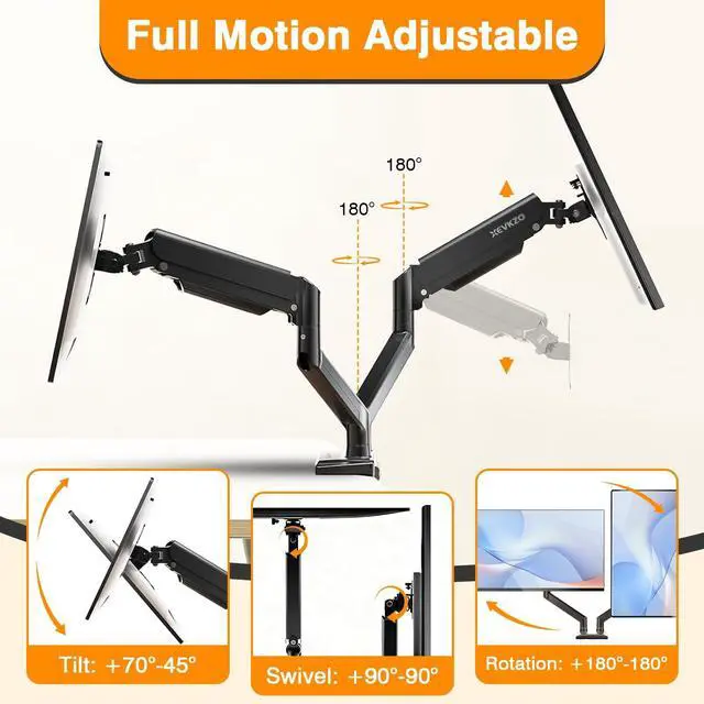 Full Motion Flexibility: Each arm independently adjusts with +70/-45 tilt, 180 swivel, and 360 rotation. Height adjustable up to 17.3" with 20.6" extension range for optimal ergonomic positioning. Our dual monitor arm for desk raises monitors to eye level, improving posture, relieving strain on neck & shoulders while increasing productivity levels.