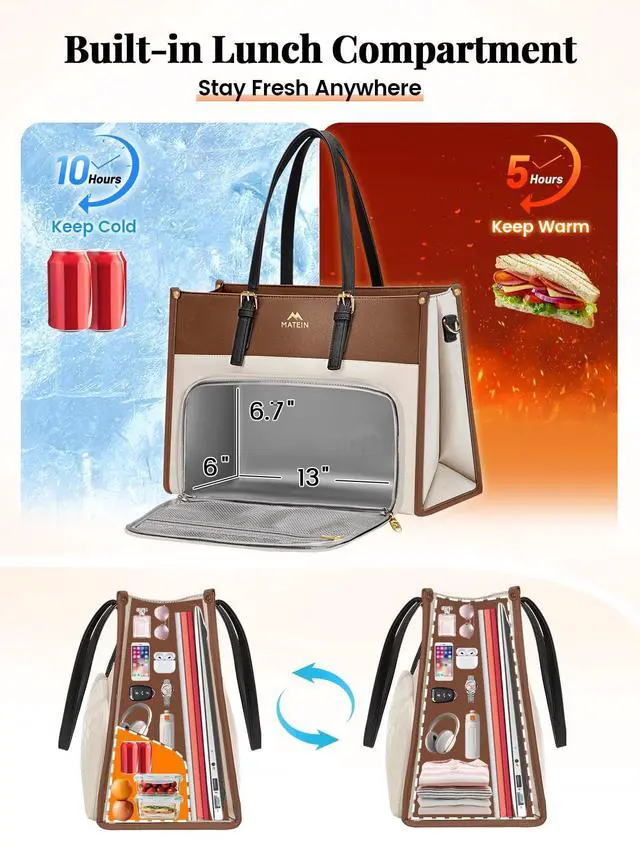 Laptop: This work bags for women with lunch box designed to hold laptops up to 15.6 inches with a padded, secure compartment. Purse lunch bags for women also includes a dedicated key holder, a back anti-theft pockets, and space for documents, chargers, and daily essentials. The structure of the large lunch tote bag for women ensures your belongings stay organized and protected throughout the day. Perfect for commuting, business trips, or casual weekends ^^ Ideal for Work, Commute, Picnic