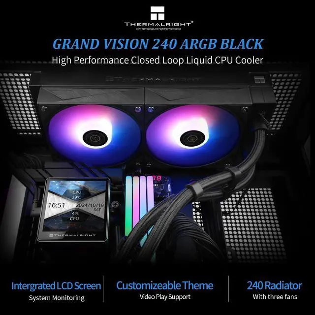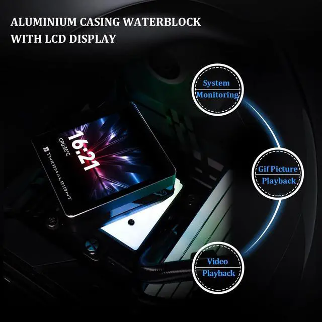 The pc fan's high speed of 2150 and 240 specification radiator quickly remove high temperatures ^^ [Optimization of Details] The pre-installed fan of the radiator and the included water guide clip can be installed simply, 7-pin parallel, support 2 fans of power supply and lighting interface in series, convenient cable management. The IPS LCD display with 480x480 resolution can restore the color more accurately, and the display screen can be freely customized ^^ [Unique Design] IPS LCD screen adopts a modular design with magnet suction, which can be freely turned and quickly installed and disassembled, no need to fix the cold head screen with screws, the water pump head has a logo, and the black cold head and ARGB fan are perfectly matched together, which can also increase the interest of color while high cooling ^^ [Wide Compatibility] The cooler supports