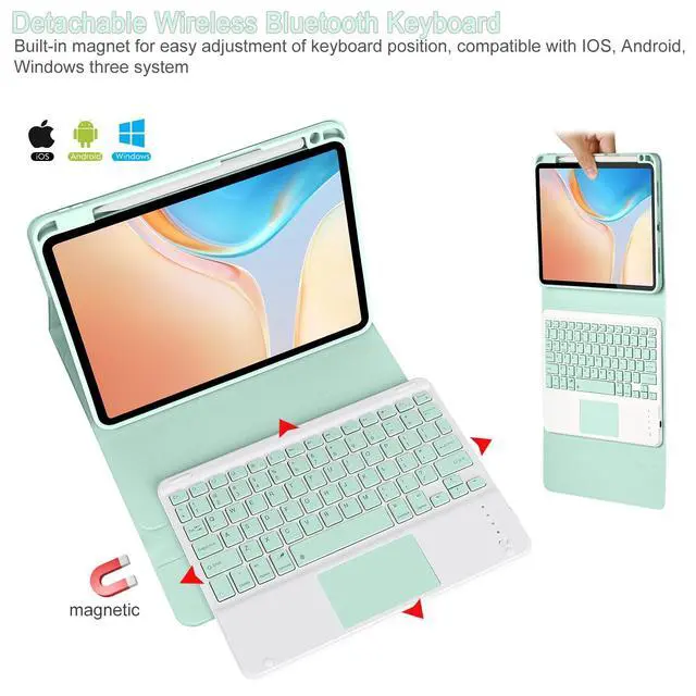 Note: Please Upgrade your tablet software to iPad OS 13.4 to fully access to the touchpad function. ^^ Magnetically Detachable KeyboardThis iPad 10th/A16 11th gen case with keyboard is magnetic so it can be easily repositioned or removed from the case. The case has 3 grooves to adjust the viewing angle as you like, make your ipad stand steadily. You can adjust to the optimal angle for studying, working, or entertaining. ^^ Convenient Pencil HolderThe iPad 10th/A16 11th generation keyboard case designed with pencil holder and pen slot on top to place and take the pen easier, and support Apple Pen magnetic attached for easy storage.