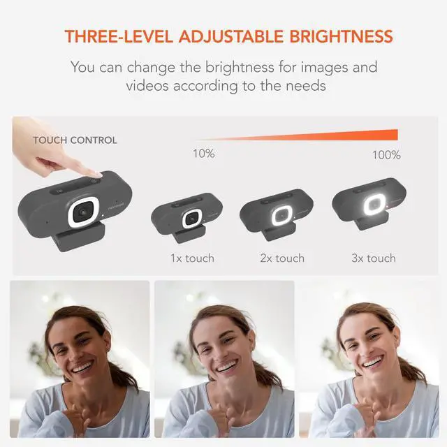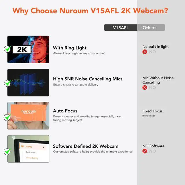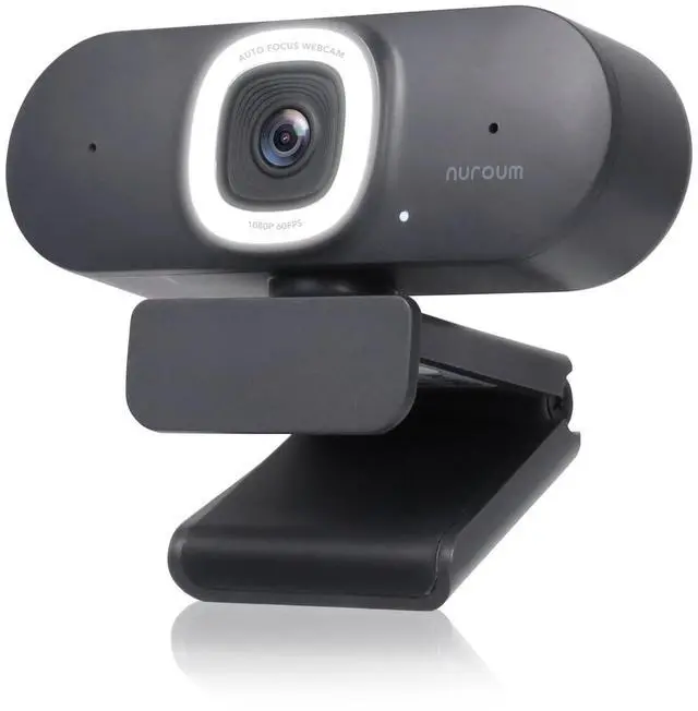 Full HD Webcam with Ring Light The 3-level adjustable ring light with touch control allows you to select the desired level of brightness, depending on the lighting conditions in the room. Ideal for streaming like live gaming streaming, video conferencing in the evening etc. The multi-layer high-quality glass lens of this streaming camera is equipped with 4MP CMOS and captures crisp and lifelike 1080P/60FPS videos and 2K 1440P/30FPS images. ^^ Faster and More Precise Autofocus NUROUM V15-AFL webcam has an autofocus feature, so nearby objects or persons remain crisp and in focus. This technology can distinguish people from walls and windows and apply the necessary optimization and focus.