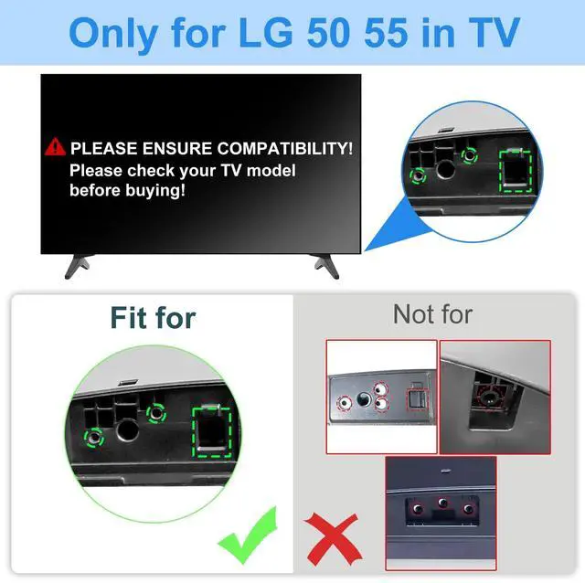 (Please Note: Only for the models we list. NOT for other LG TV models. ) ^^ With Anti-Rust Screws--- Upgraded anti-rust screw kit, offers superior protection for the bottom of your TV, ensuring its longevity and stability. ^^ Fast & Easy Assembly--- The TV feet for LG TV legs 55 inch are easy to assemble in a matter of minutes. No need to hire expensive professionals for help. Enjoy the convenience of a quick and easy assembly. ^^ Drill-free Installation--- TV stand for LG TV feet safeguarding your walls from damage and unsightly holes, preserving their pristine condition.